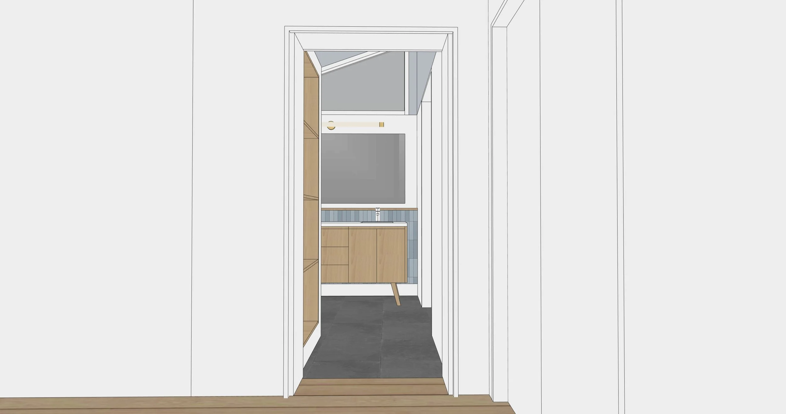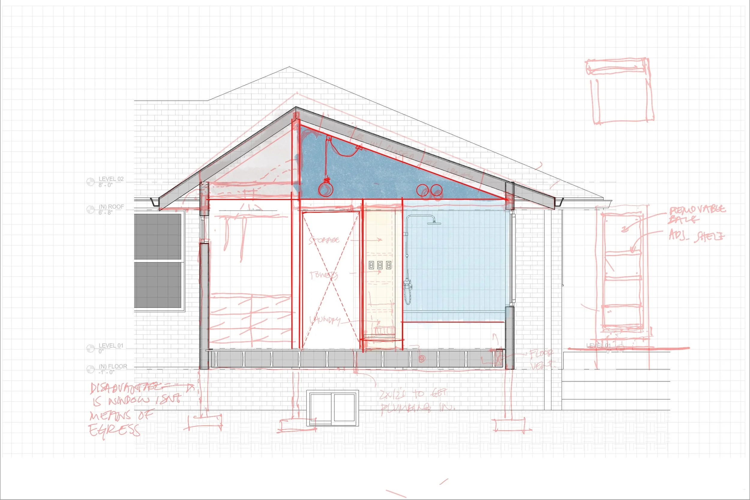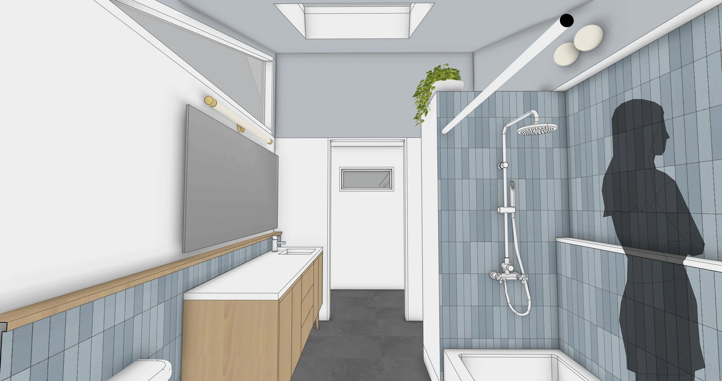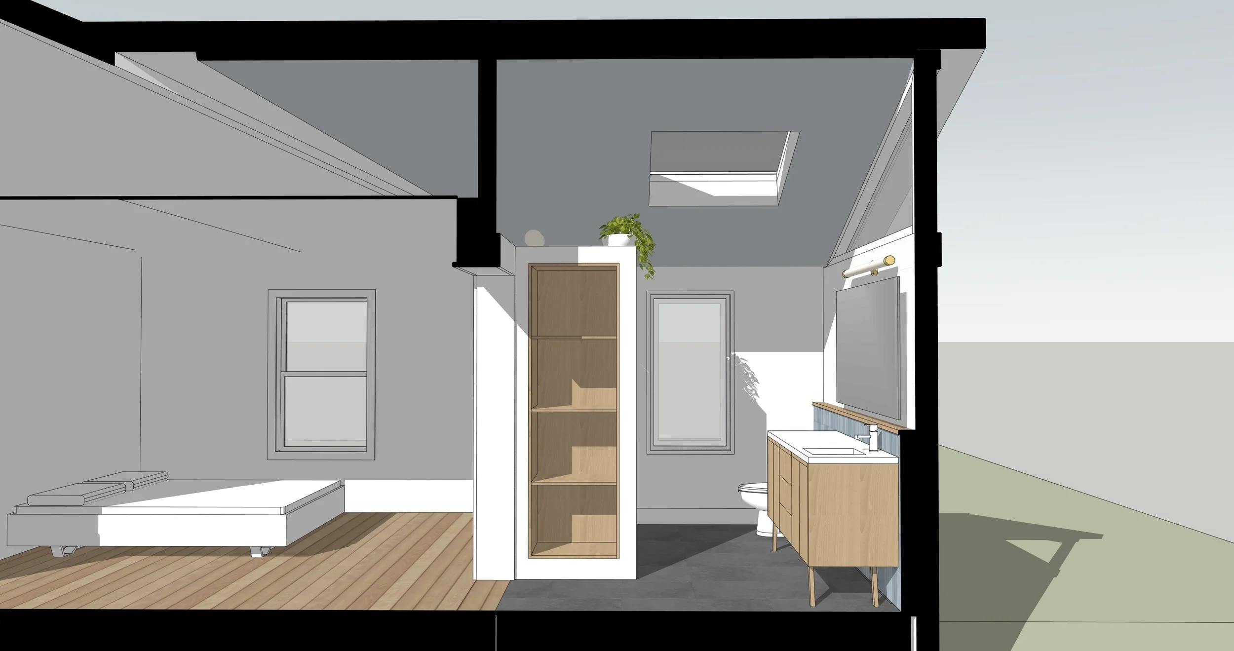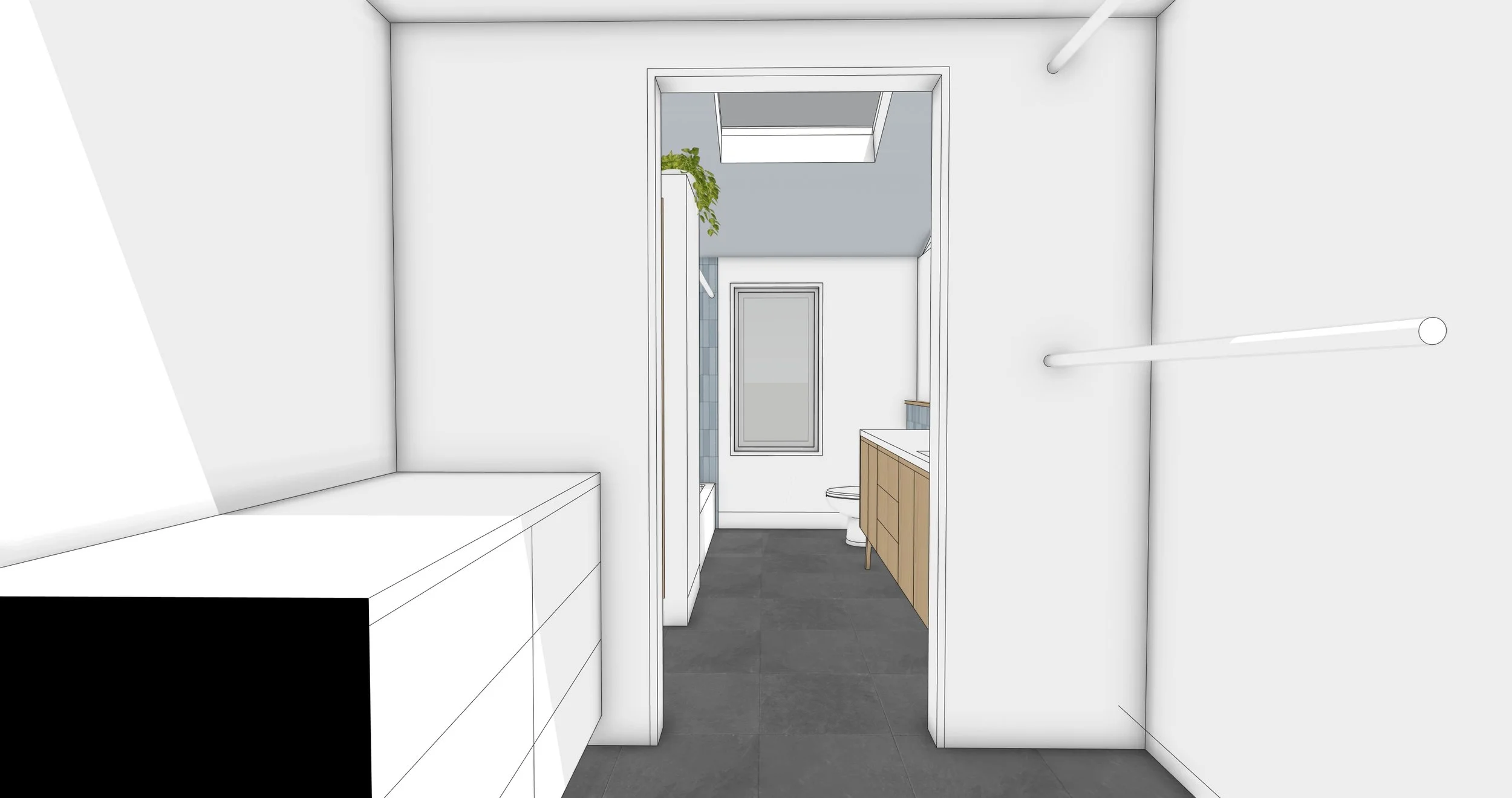 A growing family approached us with a simple problem: can we add a simple primary bath to our house with lots of natural light and some storage space? After several iterations, we landed on a scheme with an asymmetrical gable that allows the ceiling in the bath area to be vaulted. A triangular clerestory window up high as well as a skylight bring lots of natural light into the space. Pops of color at the shower and behind the vanity make things fun while natural wood tones at the linen closet and vanity bring warmth to the room.