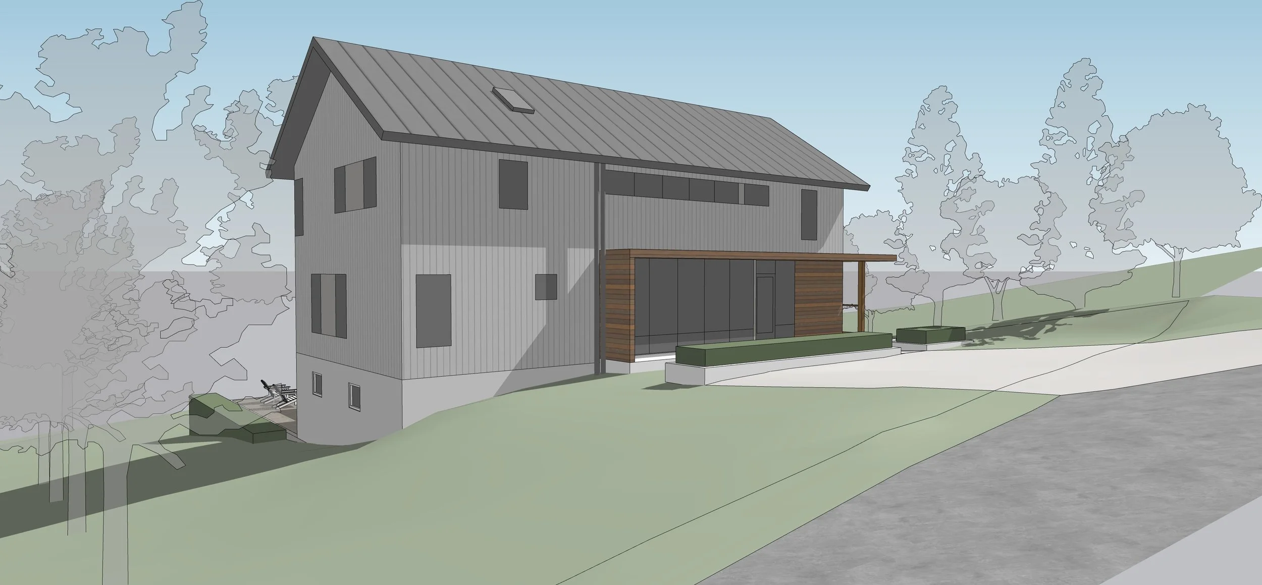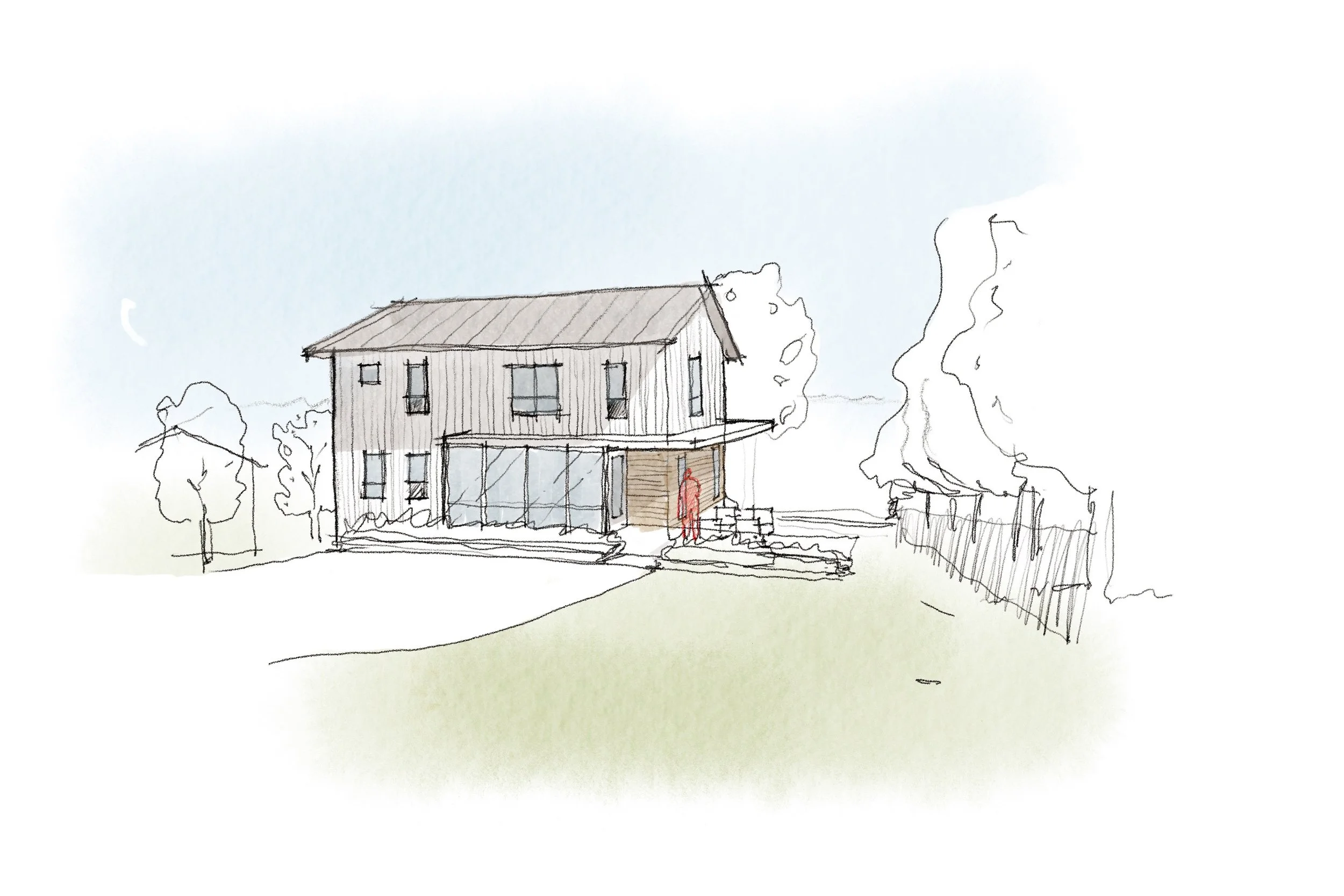 A double-height living room and exposed joists bring connection and interest to an otherwise simple gable building.