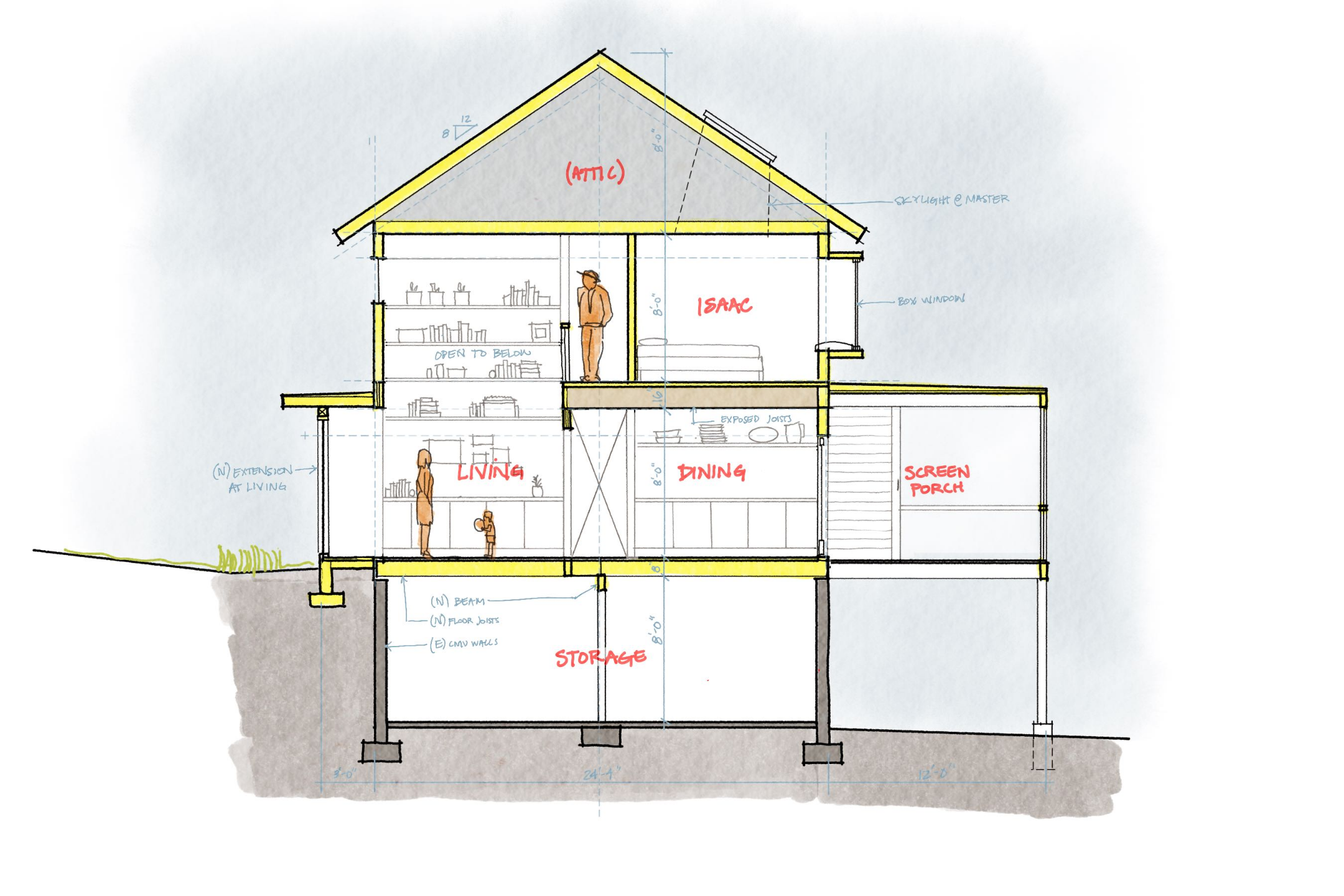 A growing family approached us with a ubiquitous brick rancher that was undersized and outdated for their needs. To save on costs, we decided to reuse most of the existing foundation and walk-out basement while adding two new floors above. The resulting house is simple in it’s floorplan and volume, but nuanced by material and sectional relationships. A double-height living room connects indirectly to a circulation balcony above, as well as a connection between the informal desk space to the entry below. Exposed wood joists and birch ceiling in the dining room make that space feel taller and provide a material warmth. On the exterior, a covered wood front porch wraps around and turns into a pergola and screened porch with access to an on-grade patio space below.