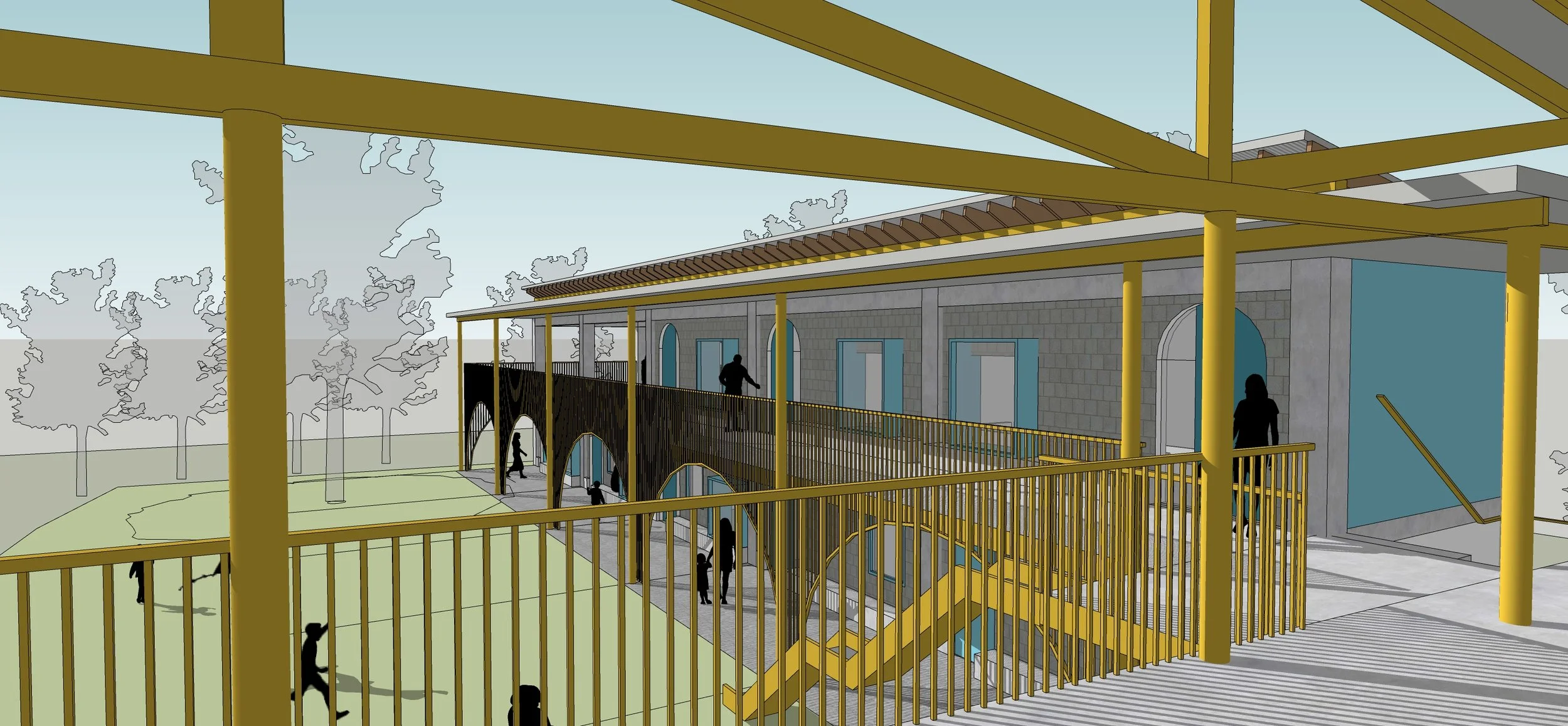 A sun scrim, slide, and pop-out windows are fun features which aim to connect classrooms to the courtyard beyond.