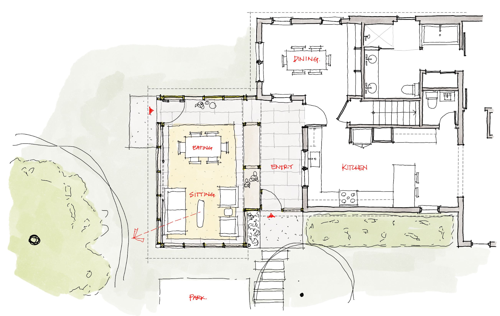 The prompt of this project was to rethink what a screened porch might be should it sit alongside a historical home in the heart of Charlottesville. The result is a wonderfully inhabitable garden room that serves as a link between the garden spaces, lively street, and the interior of the home. Its simple shape respects the home's historic architectural style while holding it own as something new. Care was taken in the details to create a special place in which to relax, eat dinner, and play games. The warm cedar lining of the canopy extends outside of the screening, blurring the boundary between inside and out. A steel rod cross brace not only provides lateral support but also adds an aesthetic element of interest. The top of the horizontal rail is a perfect spot to set a drink while a strip light on the bottom provides a band of light at dusk.